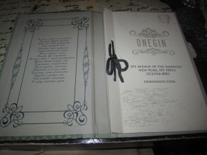 We chose the Greenwich Village-situated, new-ish Onegin, which, as a matter of fact, features portraits of that very author on their ceiling, as the eatery is named for one of his most famous title characters. (If you have time, please look it all up. It’s very interesting reading.)
