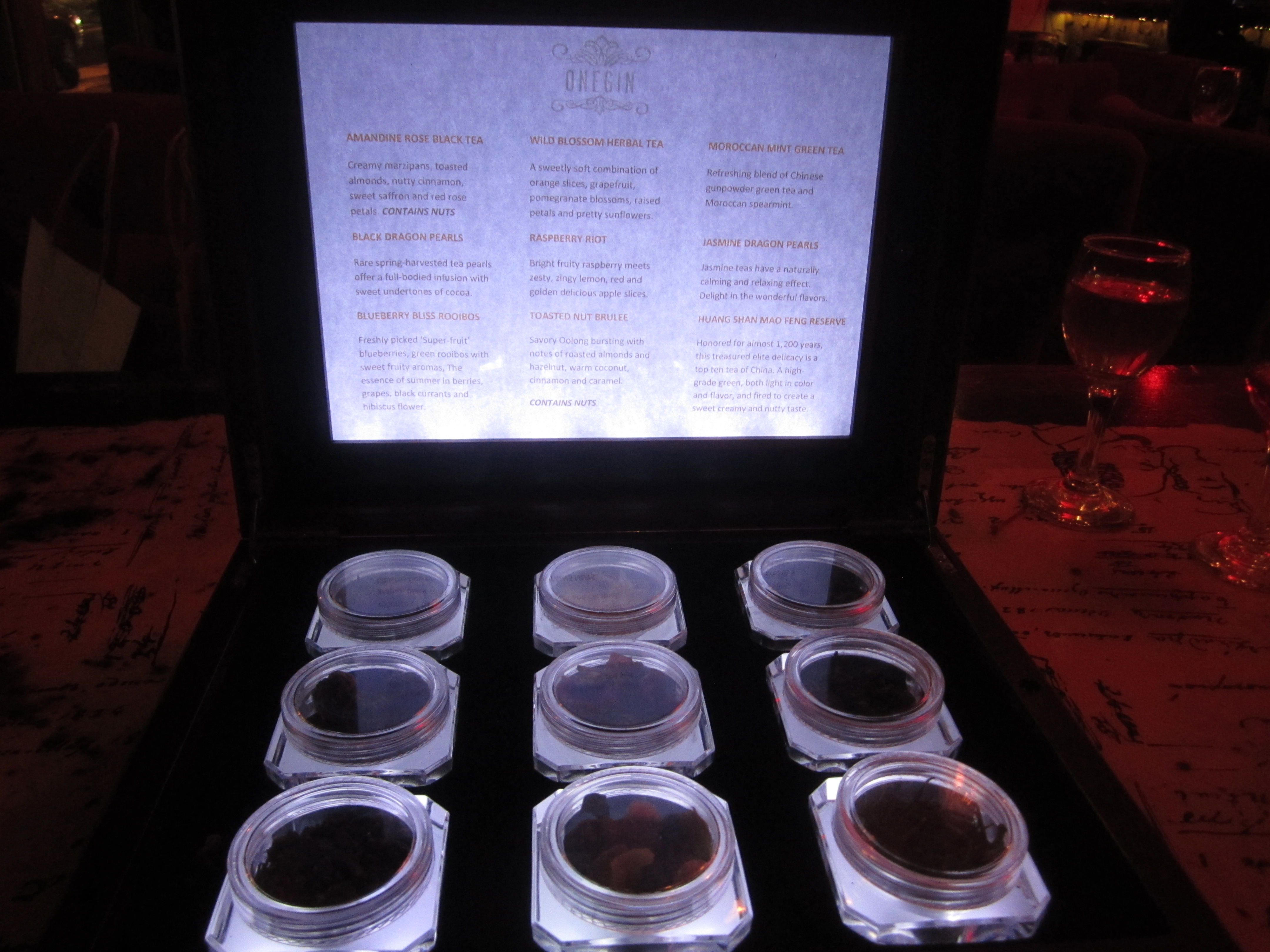 First, they bring you a box of raw teas in lit-up plastic disks, with colorful descriptions of them in the top of the box. You choose the one you want, and then it comes in a petite pot on a tray with lemon slices, honey, jam, raw sugar cubes, and two beautiful tall tea glasses with long spoons. It’s pretty impressive and makes drinking tea more special than the norm.