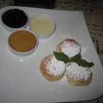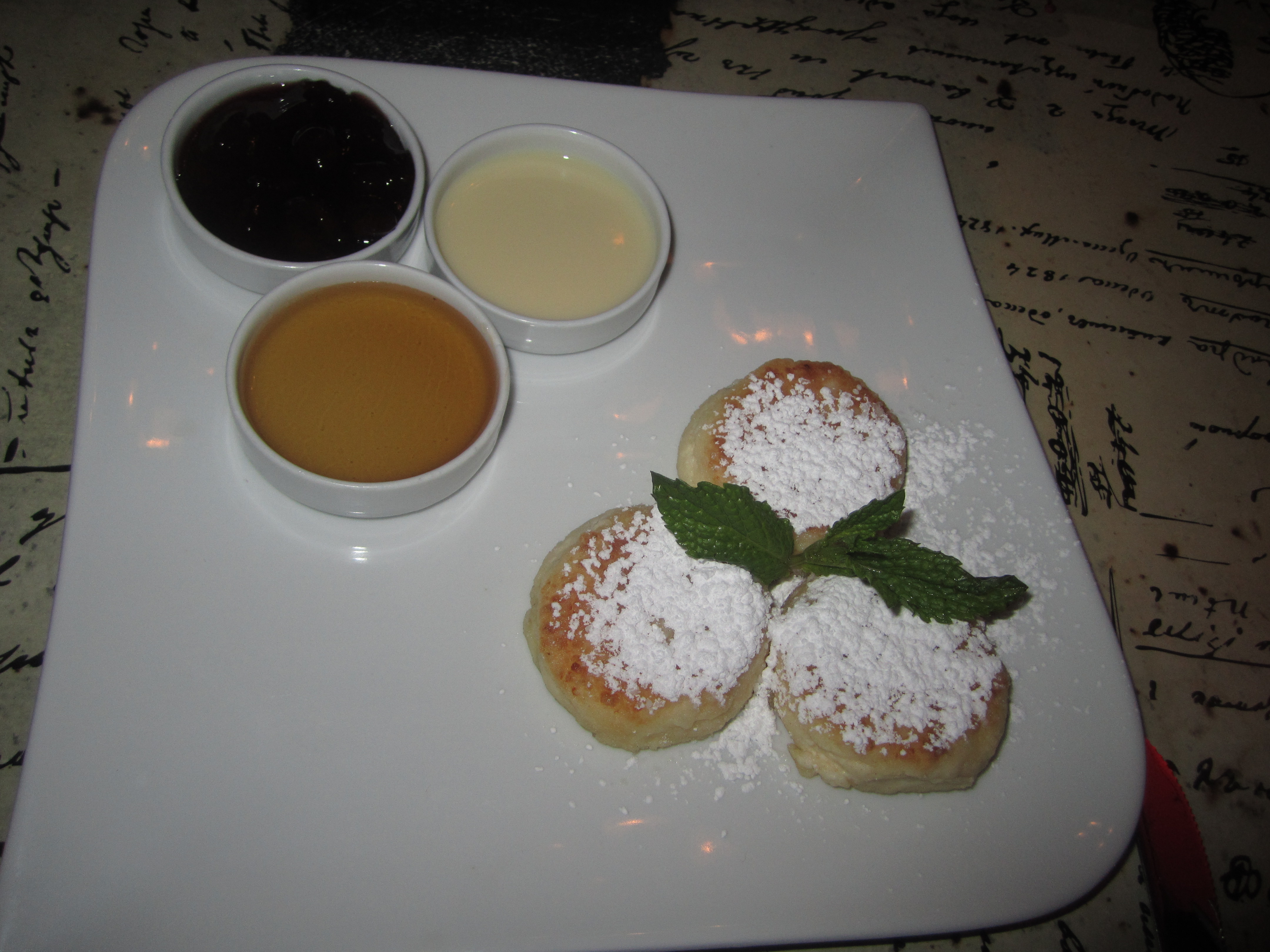 I mean it when I say “light”; Mr. X had just sorbet with berries and said it was the perfect ending. I tried the “Russian cheesecake,” which is not cheesecake at all! It’s three mini-cakes that are more like cheesy pancakes. They’re served with tiny dishes of honey, evaporated milk, and jam. I actually wound-up taking them home for breakfast the next day, for which they were perfect.