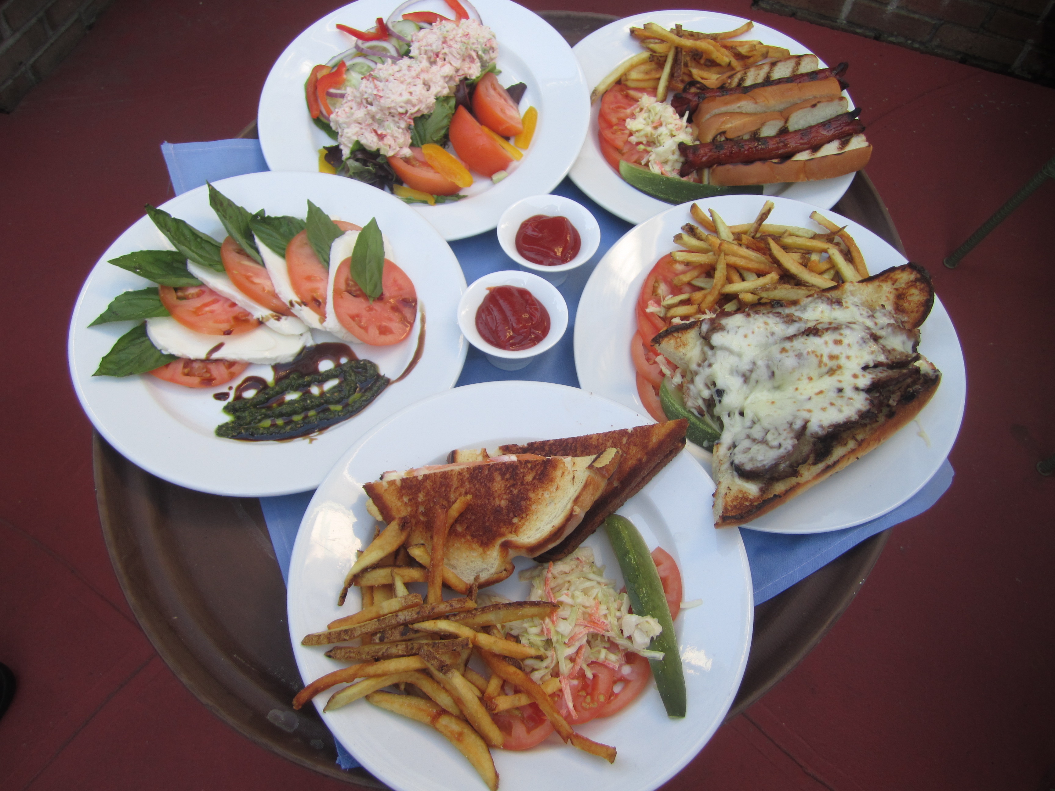They also loved the pinwheels (a fun category on this menu) with salmon, cream cheese, and capers. And they went to town on the sliced steak with mozzarella sandwich; I had only some of the juicy garlic baguette it came on, (by choice,) and loved it, too.