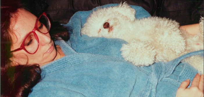 Karen Salkin and her precious Clarence, The Singing Dog. Photo by Mr. X. (Who else would be around when Karen is napping?)