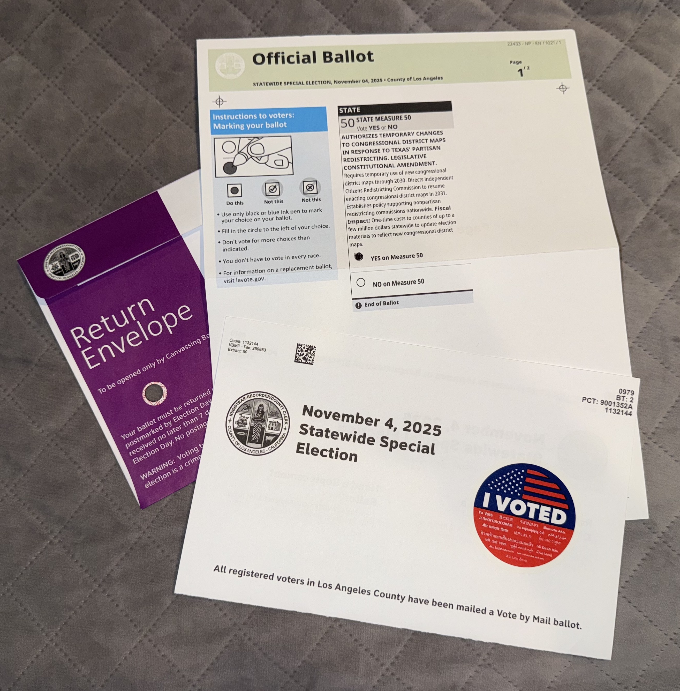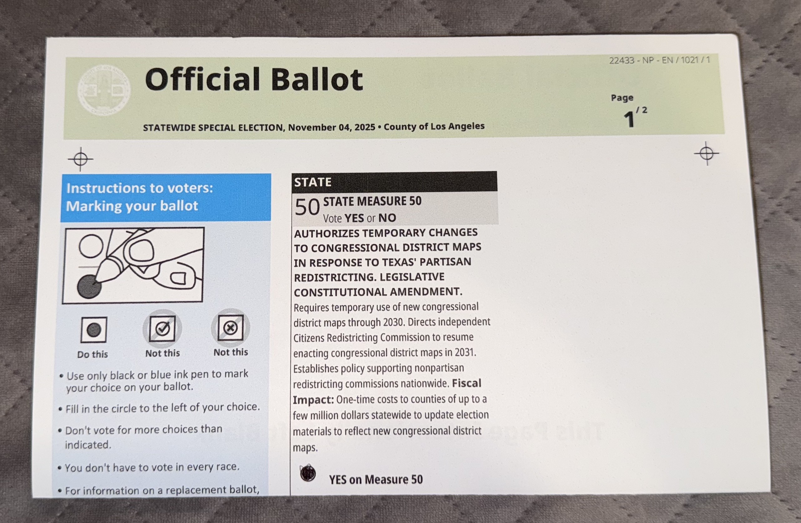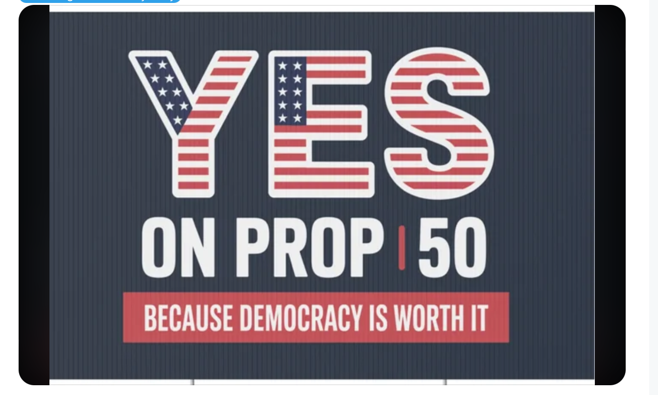 In case you’re not in the know about this situation, this is the basic statement about why Prop 50 is so important: “Donald Trump and Texas Republicans are making an unprecedented power grab to steal congressional seats and rig the 2026 election before voting even begins. Other Republican states are following suit. They want to steal enough seats to control Congress regardless of how the people vote. If Californians don’t act now, Donald Trump will seize total power for two more years.”