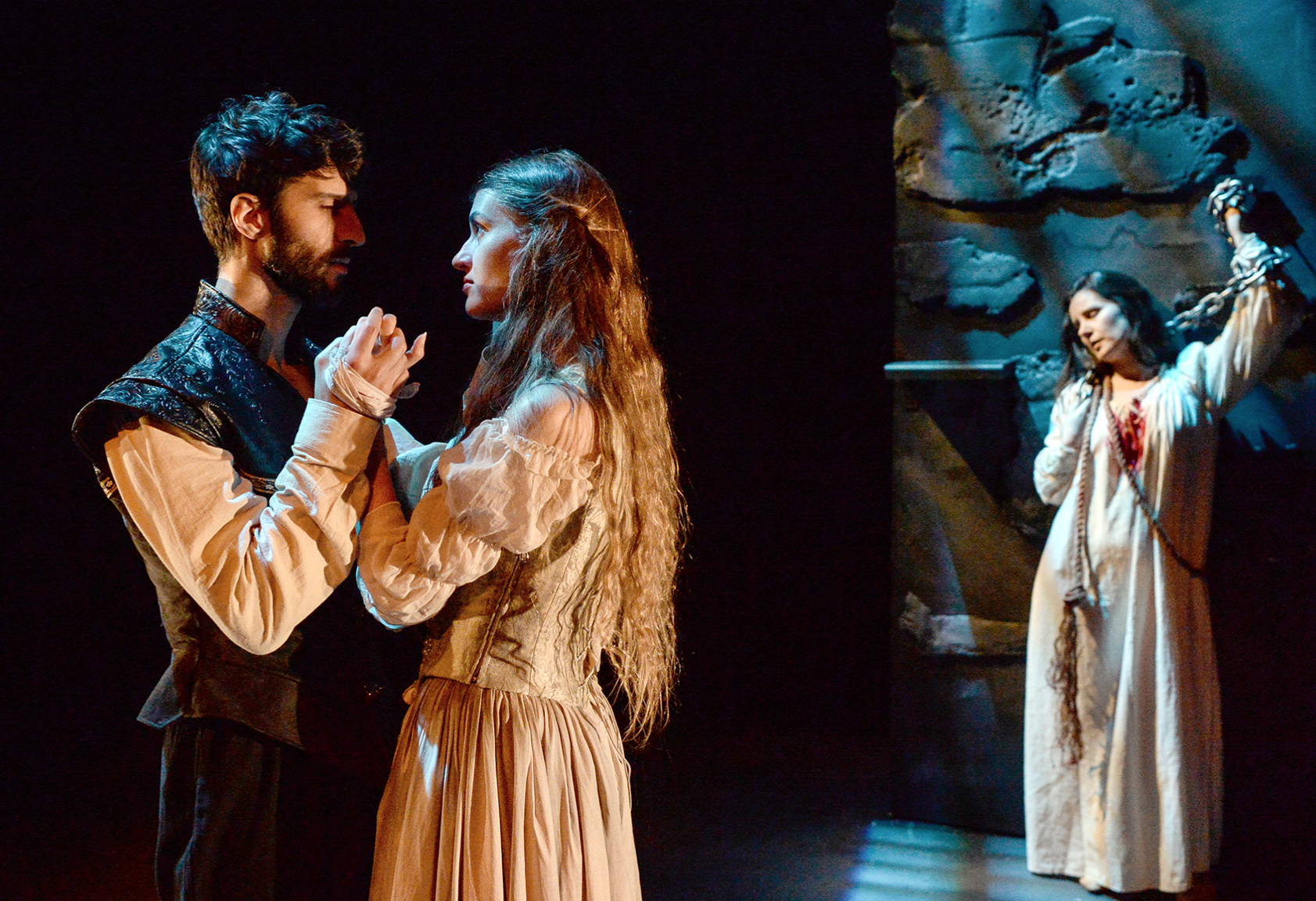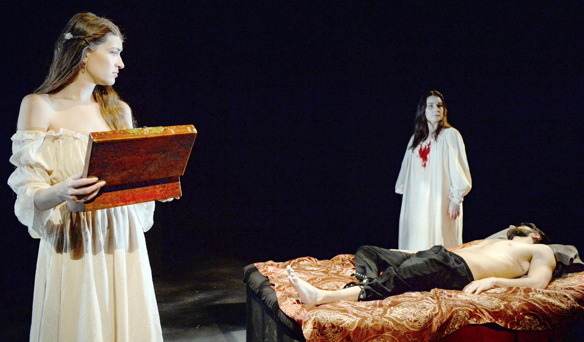 Speaking of old times, I have no idea why the program states that the time is “Sometime in the past or the future.” This is Bluebeard, for goodness sake! (Or his son; I couldn’t figure-out who the guy is really supposed to be.) There’s no way this is happening in the future! Murders do happen all the time, of course, and will continue to in the future, but not in that attire, nor in that setting. So it’s odd to put that line in the program.